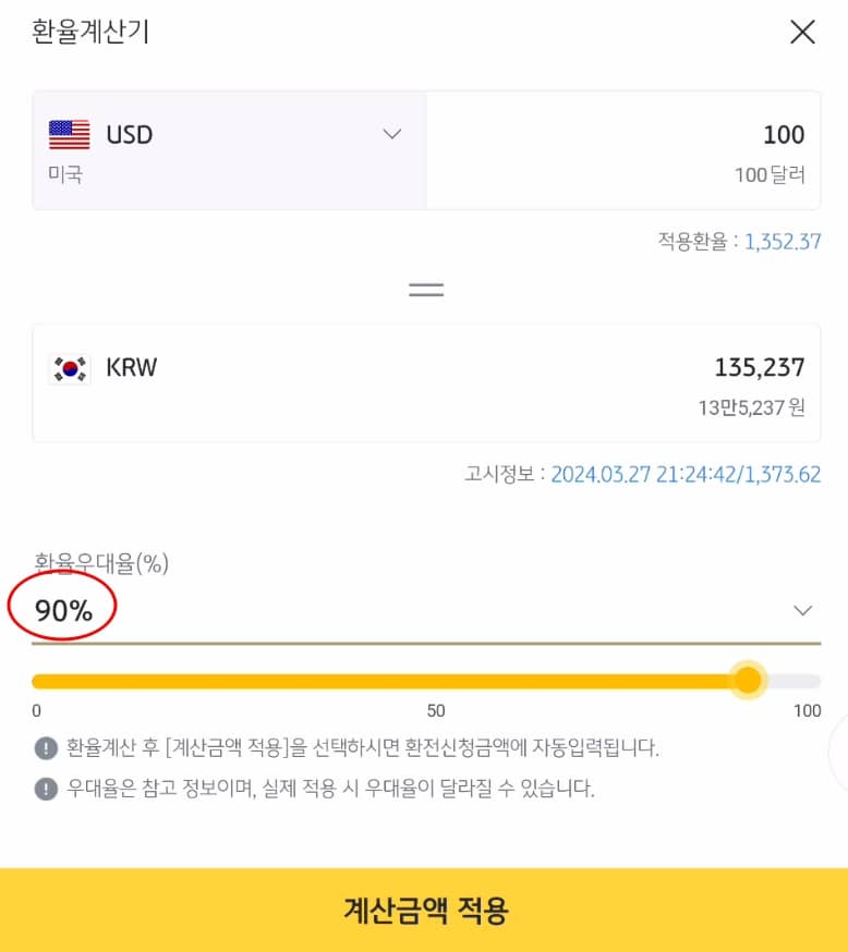 ㅇ 우대환율 90% = 환전수수료 할인율 90% = 고객 부담 환전수수료율 10%(100%-90%)