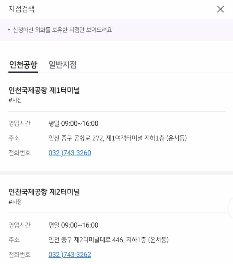 ② 은행에서도 일반지점과 인천공항(우리, 하나, 국민 등 3개 은행 해당) 서로 다르게 적용합니다.
